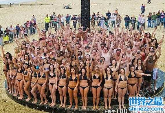 吉尼斯世界纪录的官方评判员说:“伯恩茅斯海滩的人们要好好庆祝他们的荣誉,他们打破了最多人同时同地洗澡的记录。”