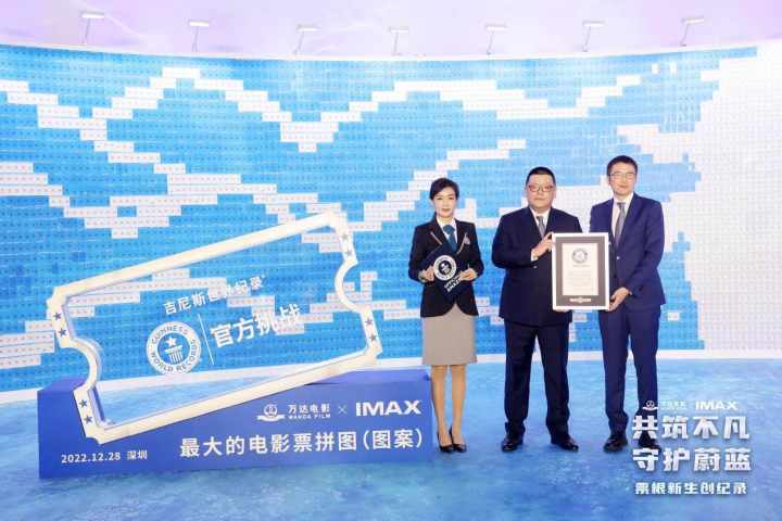 12月28日,万达电影携手IMAX在深圳龙岗万达广场共同挑战吉尼斯世界纪录。在现场嘉宾、挑战参与者和观众的共同见证下,由69位影迷志愿者历时26小时完成的61平方米《阿凡达:水之道》电影票拼图,成功认证“最大的电影票拼图(图案)”吉尼斯世界纪录。