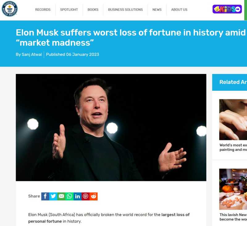 IT之家 1 月 9 日消息,吉尼斯世界纪录官方宣布,埃隆・马斯克(南非)正式打破了历史上最大的个人财富损失世界纪录。