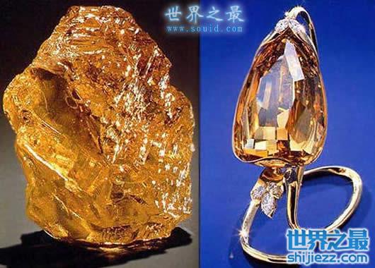 英王权杖上那颗非洲之星,库里南I重530.2克拉,曾经是世界上最大的钻石,不过在1988年之后,金禧钻石成为世界上最大的钻石,金禧钻石重达545.67克拉。从名字就可以得出,它是一颗金黄色的彩钻,实际上金禧钻石(如上图)比金黄色还深一些,宝石的切割者称其具有金色魔力,但是个人还是更希望称它为褐色,现存于曼谷大皇宫。