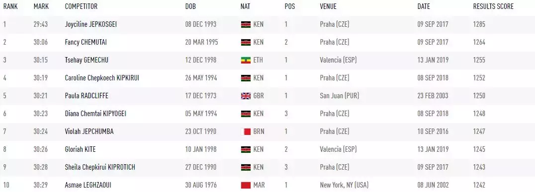 2017年9月9日,肯尼亚选手乔塞琳-杰普科斯盖(Joyciline Jepkosgei)在捷克布拉格举行的10公里比赛上,跑出29分43秒的成绩,创造了新的世界纪录,也成为在路跑10公里比赛中第一个打开30分钟大关的女子。