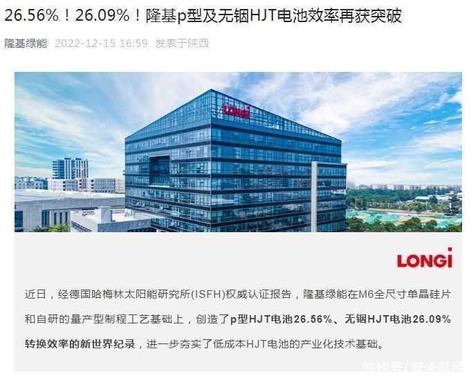 再创世界纪录!隆基绿能(601012.SH)p型及无铟HJT电池效率分别达26.56%、26.09%