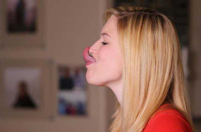 不仅可以触碰到鼻子和下巴,甚至稍微借一点儿力,她就可以舔到自己的眼睛,完成这项99.99%的人都完成不了的高难度动作,我国寓言故事中提及的“长舌妇”大概字面来看就是大概就是这个样子了吧。