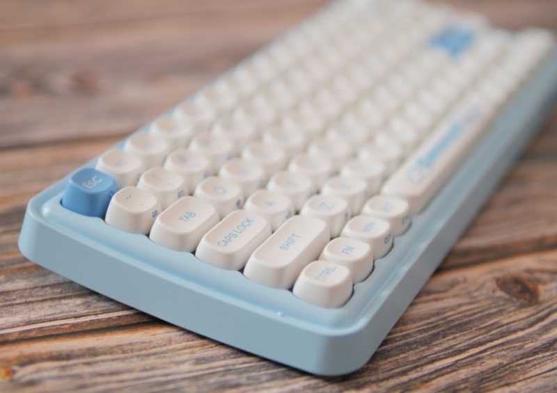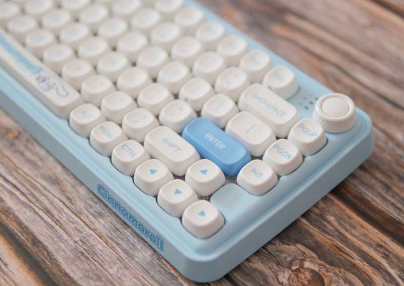 整个键盘的外观为天空蓝和白色的组成,无论是键盘套件还是键帽,整体造型都非常圆润,加上这个色彩搭配,绝对可以称得上是小清新风格了。