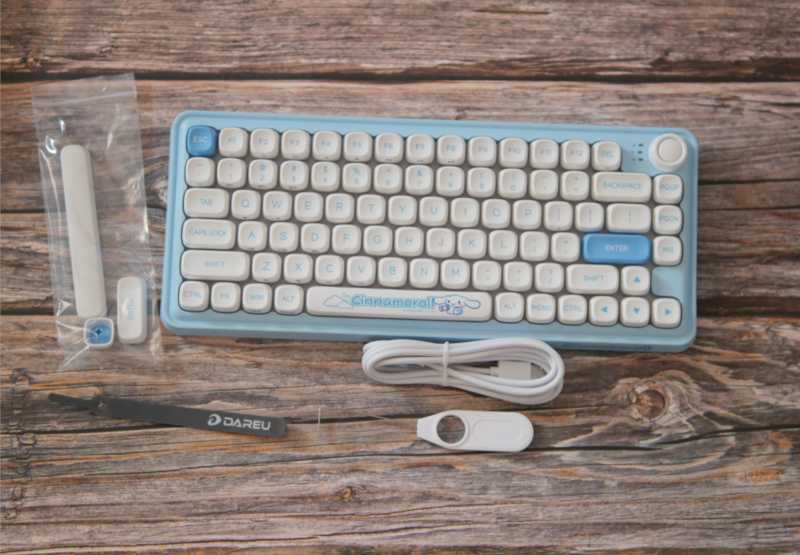 打开包装,里面配件不算多,但是也很实用,电源线、拔键器、三颗增补键帽以及理线绑带。个人建议达尔优后续把这个绑带换成白色,或者直接换成有玉桂狗元素的绑带。当然了,达尔优可能认为作为一款无线键盘,数据线和绑带本身也并不重要。