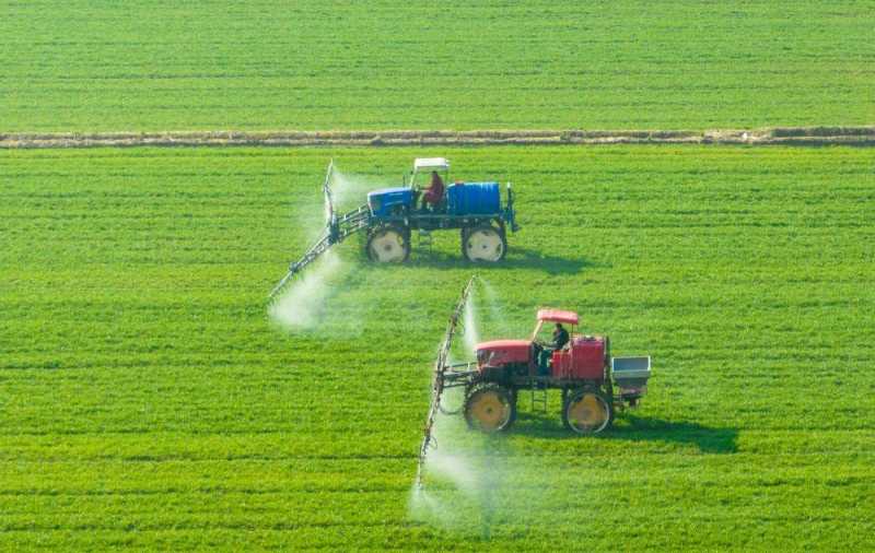 2月28日,在江苏省海安市大公镇王院村,村民驾驶植保机在小麦田间进行喷洒药物作业(无人机图片)。新华社发(翟慧勇 摄)