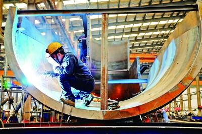 山东海德重工有限公司,工人在加工高铁墩帽。新华社发