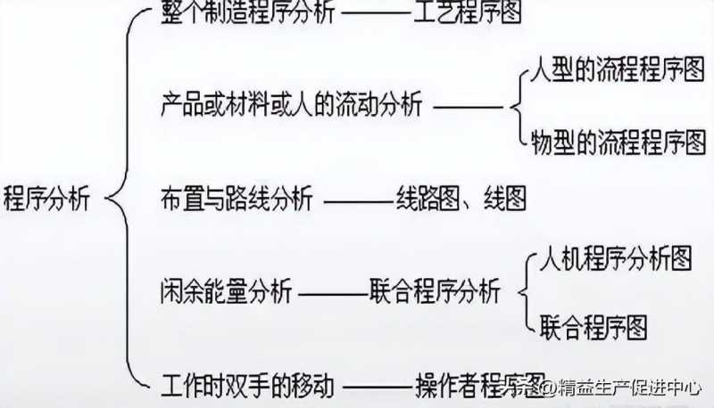 1、程序分析(整个制造程序分析——工艺程序图;产品或材料或人的流程分析;布置与路线分析——线路图、线图;闲余能量分析——联合程序分析;工作时双手的移动操作者程序图);