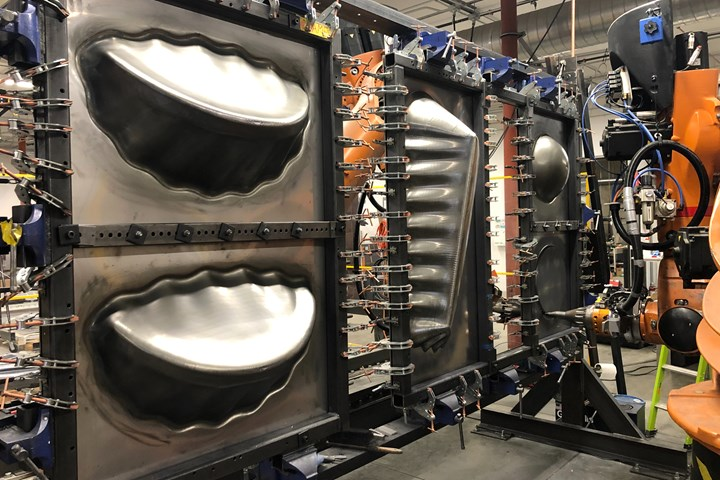 Machina 系统的灵活性使其能够在同一单元中以不同材料生产三种不同尺寸和几何形状的部件。在三天的时间里,该系统从左到右制造了两个 0.9 毫米厚的 304L 不锈钢航空部件,一个 2.0 毫米厚的铝复合叠层模具和两个 0.9 毫米厚的 316L 不锈钢圆顶,用于航空航天油箱。