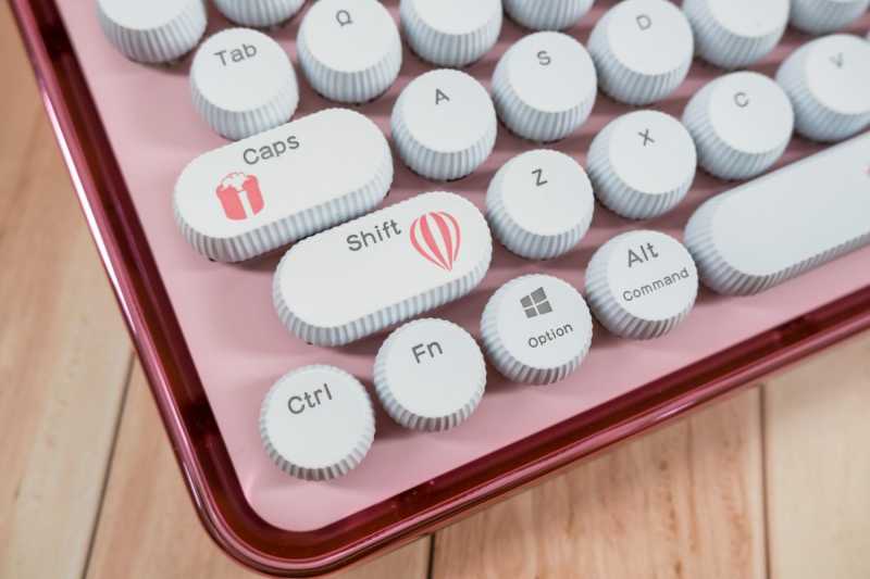 键帽的外形可爱,做工很不错,像ESC上还拥有手工涂鸦的爱心,caps和shift上有礼盒和气球图案,都非常的好看呐。