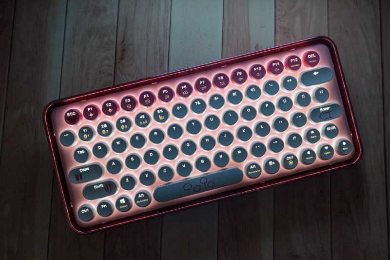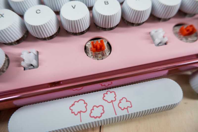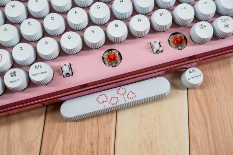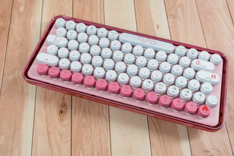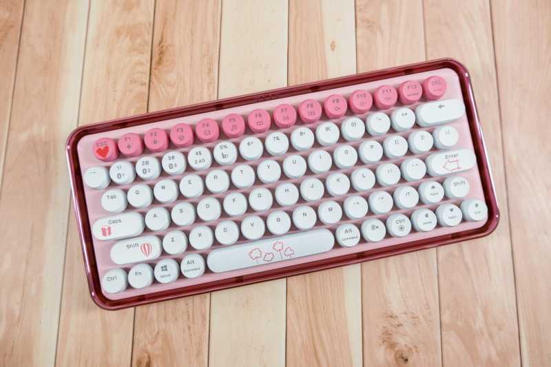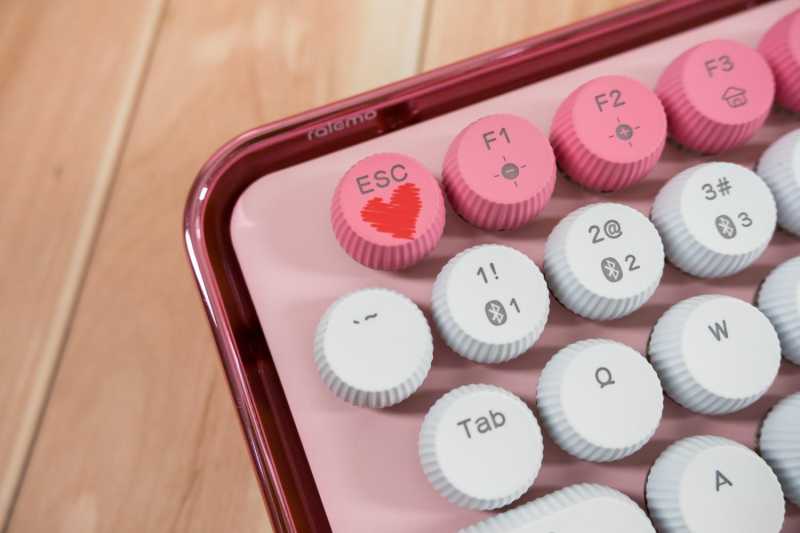 雷柏ralemo Pre 5 多模无线机械键盘是非常紧凑的79键配列,机身尺寸是312*141*43.1mm,重量仅有773克,非常的小巧便携。键帽采用了可爱的圆形百褶键帽,粉蜜桃色和白色搭配,许多键帽上还有情人节主题图案,颜值超高。