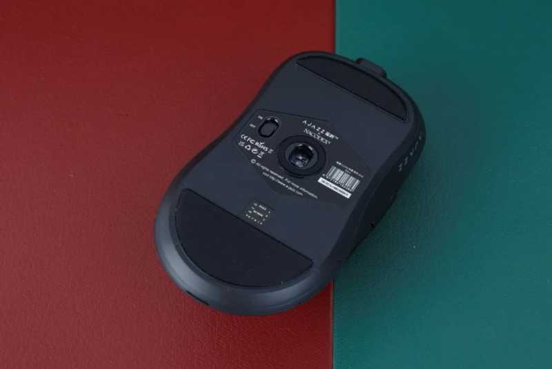 ▲黑爵AJ199双模游戏鼠标的底部除了脚贴、铭牌之外,还设计了一个电源开关。