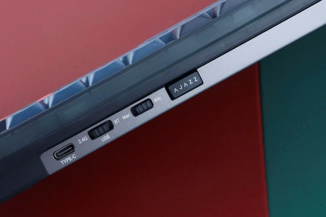 ▲黑爵AK832Pro三模机械键盘的顶部设计了Mac/Windows切换按键、连接模式切换按键、USB-C供电接口以及一个Nano USB收发器的收纳槽。
