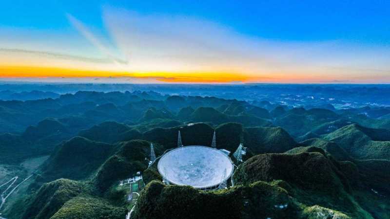 贵州平塘,连绵群山似凝固的波涛。“海浪”中央,“中国天眼”遥望宇宙,永不停息。