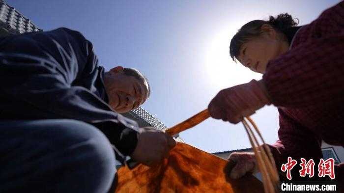 丁学生与爱人共同晾晒牛皮。(李蓉 摄)