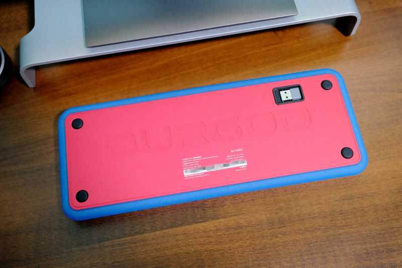 底部同样是铝合金+磨砂喷漆工艺,中间可以看到DURGOD的字母LOGO凹印,四角预置有防滑圆形胶垫,有上部的位置是2.4G接受的收纳仓,采用磁吸的方式固定,取放都较为便捷▼