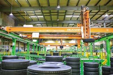 7月3日,在山东省东营市广饶县的一家获得“国家级绿色工厂”称号的橡胶轮胎制造企业,智能堆垛机正在紧张地分拣作业。 刘云杰摄(人民视觉)