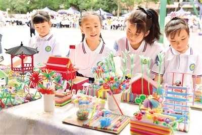 5月23日,安徽省合肥市金湖小学的学生在展示自己用废弃物品创作的百变吸管作品。 胡朝群摄(人民视觉)