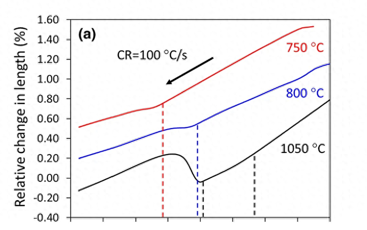 最终,在从IHT温度淬火期间,在没有任何相变的情况下,在达到Ms温度之前应该预期线性收缩。样品IHT750显然就是这种情况,它经历逐渐的热收缩,直到达到Ms温度,估计约为292°C。 对于IHT800条件,Ms估计为388°C。另一方面,从1050°C快速冷却似乎在达到Ms温度之前将样品略微转变为贝氏体。Bs(贝氏体起始温度)的大致位置也被定位并用箭头(Bs = 570°C)指出,而Ms温度在408°C左右观察到。