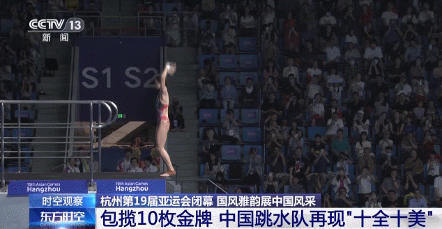 在10月3日的女子跳水10米台决赛中,全红婵在第二跳展示“水花消失术”,获得7名裁判的7个满分,这是杭州亚运会跳水比赛中的唯一一次。作为跳水项目的“人气王”,全红婵除夺得个人金牌外,还搭档陈芋汐以“断崖式”的领先优势夺得女子双人10米台冠军。本届亚运会上,中国跳水队包揽全部十枚金牌,再现“十全十美”。