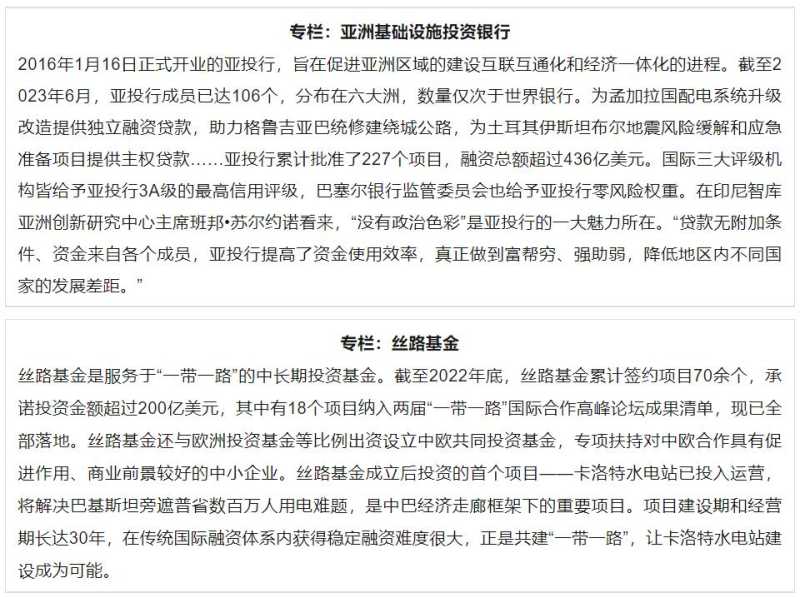 共建“一带一路”积极开拓多元化、多层次融资渠道,为新兴经济体和发展中国家经济增长“输血”。亚洲基础设施投资银行(亚投行)、丝路基金、中国开发性和政策性银行及商业金融机构,与世界银行、欧洲复兴开发银行、亚洲开发银行等多边开发机构以及国际和本地金融机构积极合作,形成透明、高效、互利的共建“一带一路”投融资朋友圈。