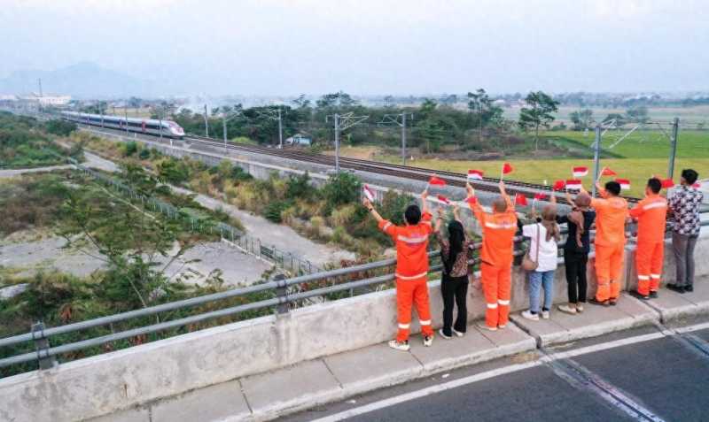 10月17日,在印度尼西亚万隆一座天桥上,雅万高铁建设单位之一中铁电气化局的中国和印尼籍员工挥舞着中国和印尼两国国旗,向远处驶来的一列雅万高铁高速动车组列车欢呼(无人机照片)。新华社记者徐钦摄