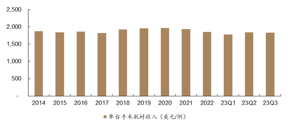 图:直觉外科单台手术耗材收入,来源:德邦医药