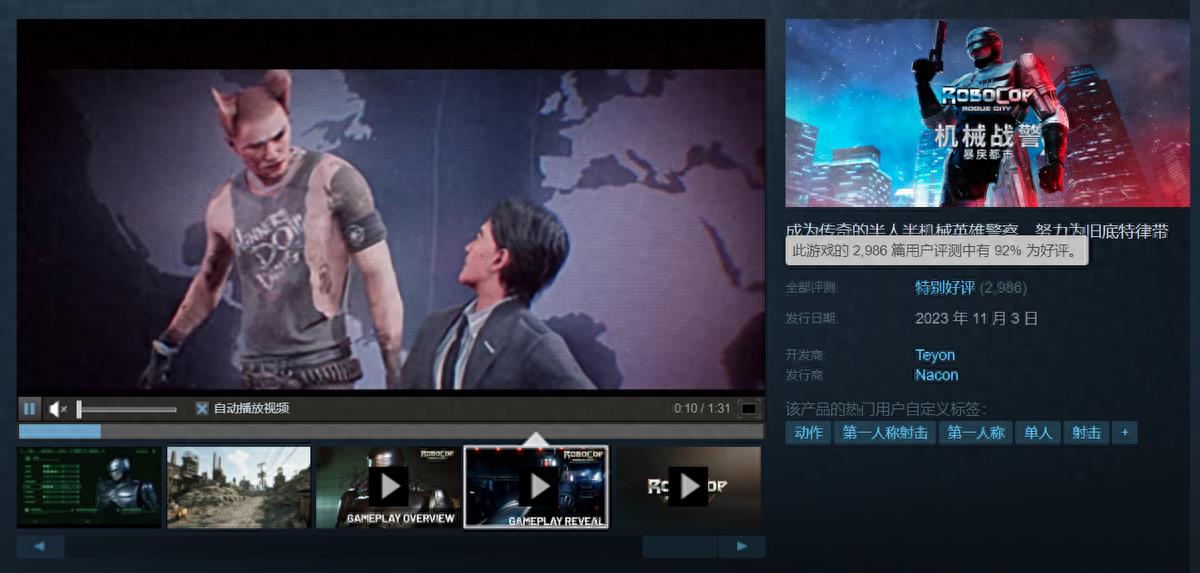 《机械战警:暴戾都市》是由Teyon制作并由Nacon发行的一款第一人称射击冒险游戏,也是继Teyon在2019年开发《Terminator: Resistance》后的第二部作品,于2023年11月2日在主机平台推出,次日在Steam上推出,截至到目前在Steam商店页面中拥有将近3000条玩家好评、整体92%好评率特别好评的评价。