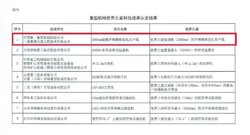 近日,中国重型机械工业协会发布《关于2023年重型机械世界之最科技成果认定结果的公告》,中国一重申报的《2680mm宽幅不锈钢热连轧生产线项目》获得2023年重型机械世界之最科技成果的认定。