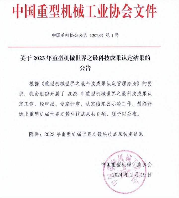 世界之最科技成果是指经中国重型机械工业协会认定,通过自主创新或协同创新突破关键技术,达到或超过国际先进水平,其中至少一项关键技术指标在认定之日仍保持着同类产品、技术世界之最的科技成果。
