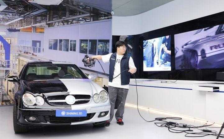 随后,大家来到综合展厅。只见一位工程师手持一个酷似魔方的不规则多边体,对着汽车这边挥一下、那边舞一下……视线一转,眼前的汽车竟“钻”进了电子屏幕里——原来,机器发出的50条蓝色激光线,正以每秒最高368万次的速度扫描汽车,约8分钟后,一个完整的车辆数字三维模型便在屏幕上跃然浮现。随着工程师转动鼠标滚轮,汽车细节在屏幕上不断放大,直至轮廓、起伏、弧度全部消失不见,只剩最原始的点、线,以及三角网格。