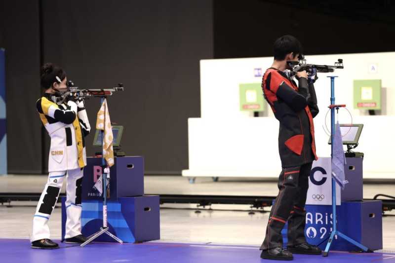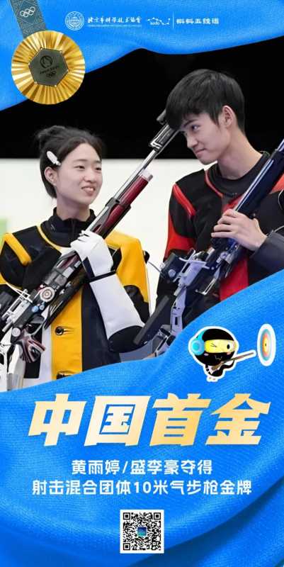 7月27日,在法国沙托鲁举行的巴黎奥运会射击10米气步枪混合团体决赛中,中国组合黄雨婷/盛李豪获得冠军。这是巴黎奥运会产生的首枚金牌,也是中国体育代表团在本届奥运会中取得的首枚金牌。