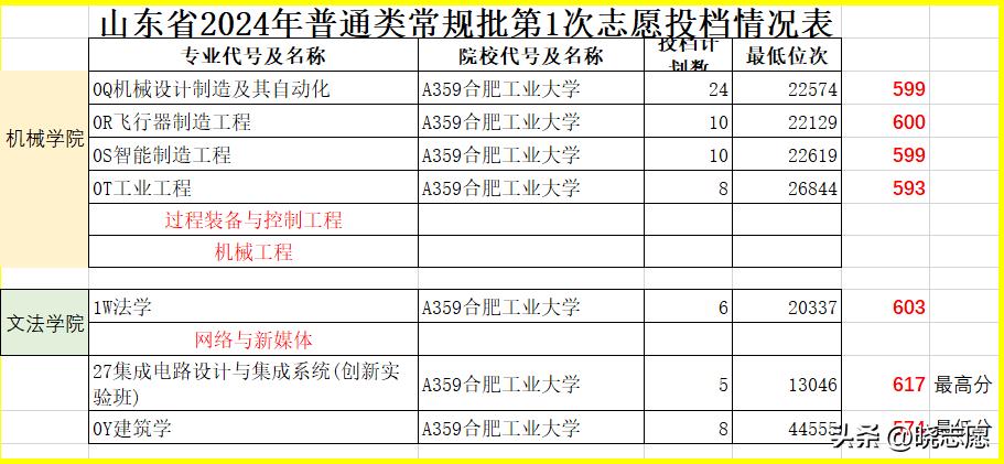 看一下合肥工业大学这所211的机械学院:有6个专业:机械工程、机械设计制造及其自动化、飞行器制造工程 、过程装备与控制工程、 工业工程、智能制造工程。2024年在山东省的招生位次是这样的: