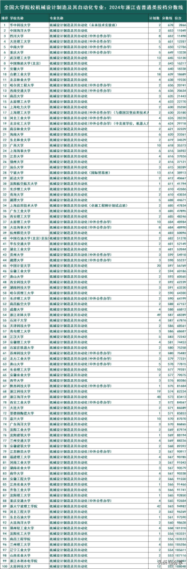 以下全国大学院校机械设计制造及其自动化专业: 2024年浙江省普通类投档分数线: