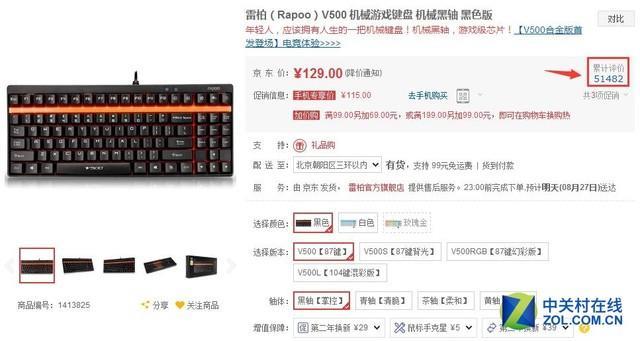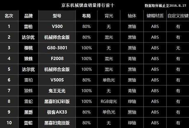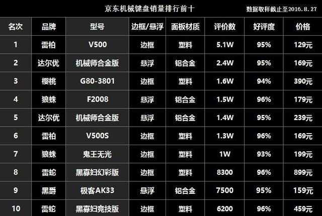 本次我们将在具有销量真实性的京东进行这次调查,对在京东评论排名前十(京东首页直接搜索“机械键盘”)的机械键盘进行分析,用数据说话。本次热度统计的排序方式:同品牌同系列的产品只选取其中评论最高的一款(同系列不同涂装、不同轴体的均选取其销量最高的一个,樱桃G80-3800和G80-3801没有影响产品本身功能性的差距,因此只取最高的一款进行排名),但同系列具有明显特征区别的产品将分别进行排名(例如雷柏V500与V500S之间有背光的差距、达尔优机械师合金版有80%和100%布局等明显的实质上区别将进行分别排名)。