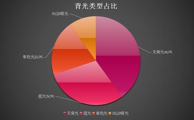 在排行榜中,V500、G80-3801、鬼王无光、黑寡妇竞技版、这四款键盘未使用背光,占比为40%;使用混光背光的键盘是机械师合金版87键、F2008、机械师合金版104键,占比为30%;单色背光的是V500S、极客AK33,占比为20%;而使用RGB背光的键盘就只有黑寡妇幻彩版了,占比为10%。从数据上来看,大家更偏向于有背光的机械键盘,而混光机械键盘虽然没有RGB效果那么出众,却非常炫酷,占比超过单色背光,还有一部分的人在消费时选择加钱购买价格相对高昂的黑寡妇幻彩版,因此消费者在这方面,更偏向于有炫酷背光的机械键盘。