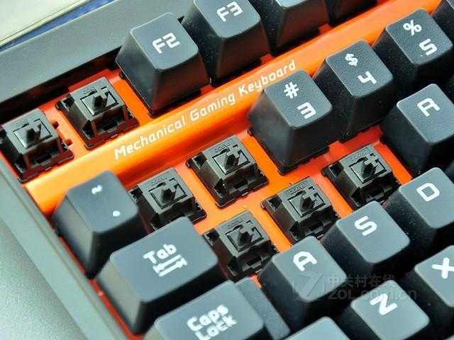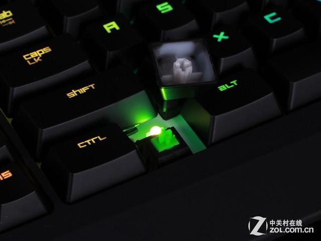 双色注塑键帽也免去了文字消失的问题,背光透过文字的效果甚是炫酷,主背光为蓝色,WASD和其他几个按键背光被设为橙色,非常醒目,只需简单一扫即可确定按键位置。