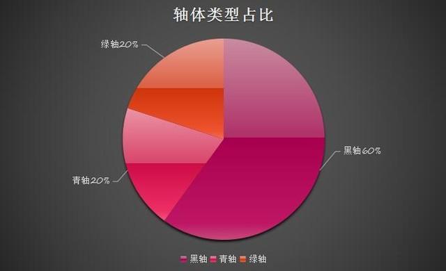 在销量前十的机械键盘中,黑轴占了绝大部分。雷蛇自主研发的绿轴拥有强烈的段落感,类似青轴,因此归纳为青轴之中,总共占比为40%。说明入门级机械键盘消费者更加偏向于黑、青两种轴体,相信黑轴占比高的原因是老玩家的建议和宣传所致,青轴段落手感也是最能最直接体验到机械感的轴体之一,对于追求纯粹机械感和节奏感的玩家来说是首选。