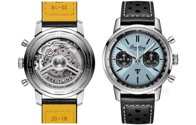 腕表点评:最后来说这款百年灵的TOP TIME,这个系列最近两年很火,尤其是跟摩托车、汽车的联名款。冰蓝盘的这一款TOP TIME是百年灵和英国凯旋摩托联名的。表径是41毫米,厚度是13.3毫米,表盘上有两个对称的凹陷小表盘,3点位的是30分钟计时盘,9点位的是小秒盘。两个小表盘形状非常独特,似圆似方。机芯是百年灵自己的Caliber 01,是一个很成熟的自产计时机芯,振频28800,动力储备70小时,背透能看到满满的机械细节。相比泰格豪雅那款,它的打磨和装饰感会再明显一些,自动陀、机芯夹板,全部拉丝,算是这三个里面最看得见的背透效果,机械风很足。