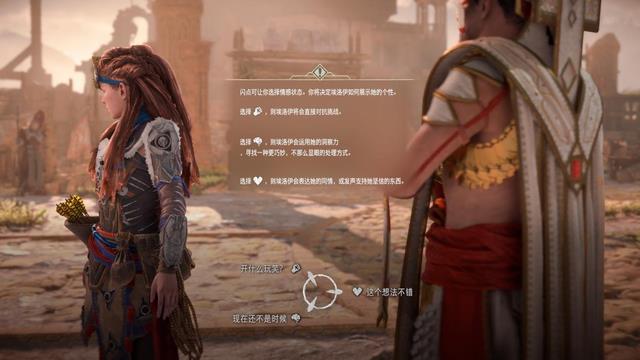 同样让人感到乏味的,还有本作对比《地平线 零之曙光》几乎没啥变化的对话系统。虽然开发团队这次的确学聪明了,知道利用电影化的分镜设计,来解决角色因站桩对话导致的剧情观赏性不足问题,但对话文本本身,依旧只起到辅助说明剧情的作用。玩家虽然有了一些对话选项分支,但其对剧情发展和人物关系的影响几乎完全不存在。每当看到主角埃洛伊与NPC们没话硬聊的时候,我都会当机立断结束交谈,把更多时间花费在赶路和战斗上。