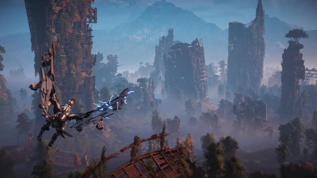 在本作中,玩家将继续跟随主角埃洛伊的脚步,一路从前作的主舞台子午城向西进发,前往探索充满未知威胁的西方绝境——也就是游戏中距今数千年后的旧金山。在这段旅途上,埃洛伊除了会邂逅多位性格迥异的伙伴外,还要穿过沙漠、雪山、雨林等多样化的自然景观地带。得益于次时代主机强大的渲染能力,玩家在路途上欣赏到的风光,相较前作又有了质的提升。无论是高山上被漫天飞雪覆盖的植被,还是到达雨林地区后,阳光穿过周围茂盛的植被,在玩家眼前铺展开的斑驳光影,或是主角埃洛伊获得水下呼吸装置后,在海边水域中看到的,如同传说中亚特兰蒂斯王国般梦幻的水下世界——这些游戏中美轮美奂的自然风光,搭配后启示录背景下的文明遗迹,共同构建出一种独特的科幻美学,成了该系列在玩法系统之外,最具代表性的游戏内容。