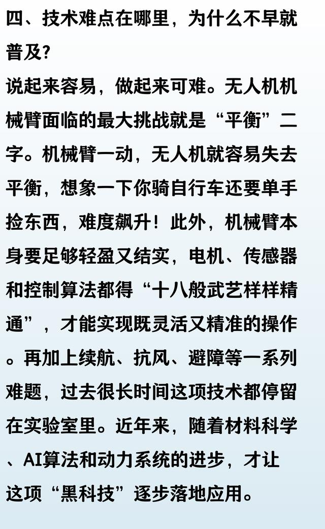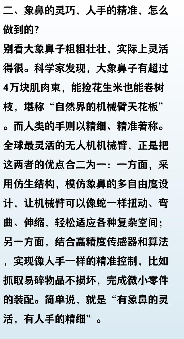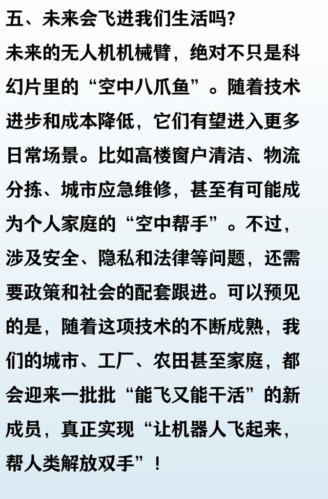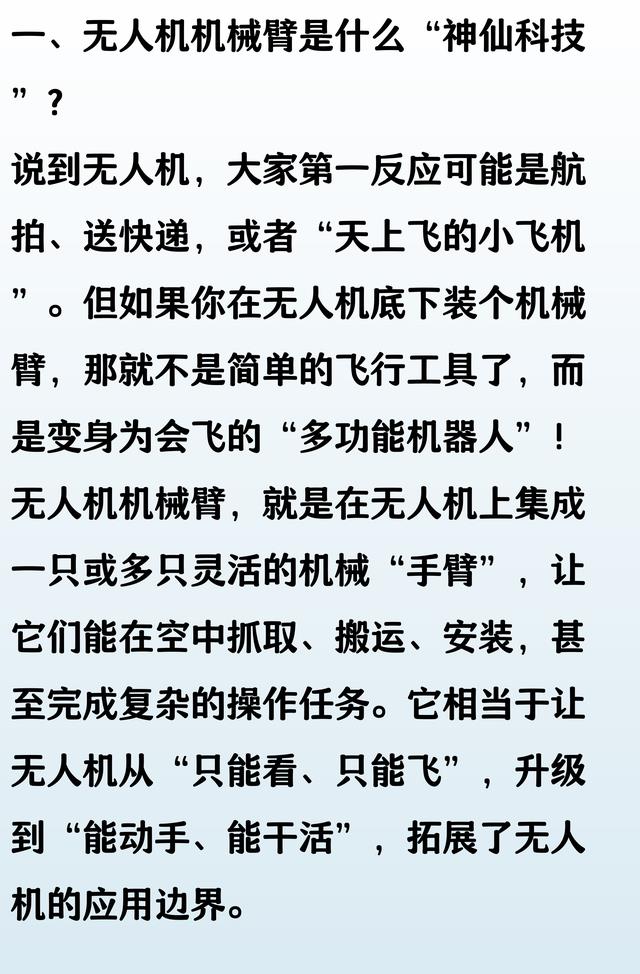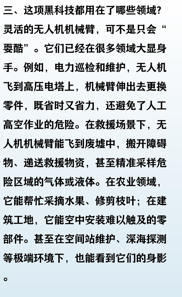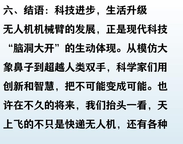 你见过无人机像大象鼻子一样灵活地“抓”东西吗?最近,科学家们搞出了全球最灵活的无人机机械臂,既能像象鼻那样弯曲自如,又能像人手一样精准操作。想象一下,未来送快递、救援甚至帮你做家务,都可能靠这种高科技“帮手”!科技的进步,真的越来越像科幻片了。