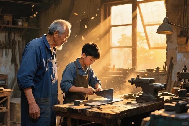 耿朝辉穿着他那身熟悉的工装,站在洒满金色夕阳的车间里,看着一个满头大汗、正在练习锉削的年轻徒弟。
