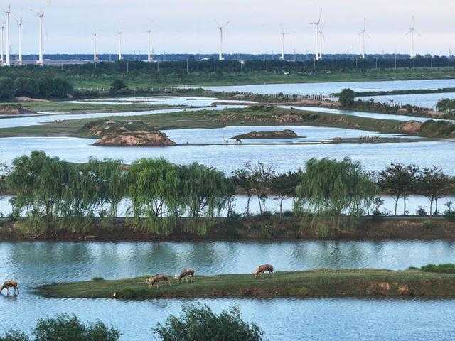 夏末傍晚的野鹿荡,风吹草舞下鸥鹭翔集,水波晃动着一群麋鹿的倒影,满目皆是生机盎然的绿,等这样的绿色一直弥漫向秋天,巨大的滩涂又会被火红的盐蒿草覆盖。当人们惊叹于野鹿荡的原生态之美,难以想象16年前这里不过是大型水利工程的填土预留地,遍地砂石、泵泥和垃圾。