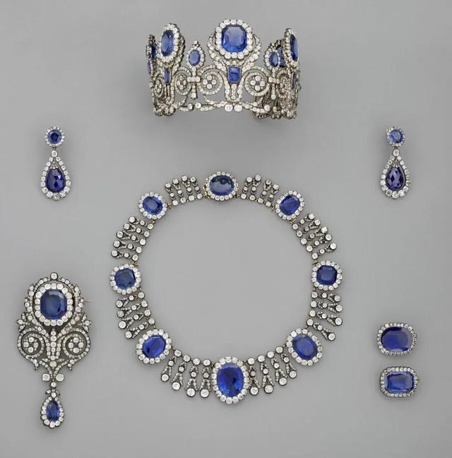 1830年七月革命成为命运的转折点,路易·菲利普意外成为法国末代国王,其妻玛丽·阿梅莉也随之加冕为后,这套蓝宝石也因此被赋予了新的王朝印记。