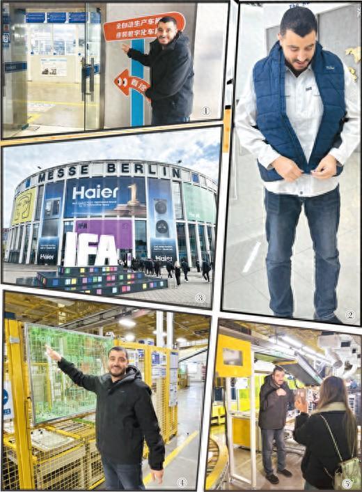 图①:老李在海尔郑州空调互联工厂生产车间门口。 图②:老李换上海尔的工作服。 图③:海尔亮相2025年德国柏林国际消费电子展(简称IFA展)。 图④:老李在车间介绍先进生产线。 图⑤:在海尔郑州空调互联工厂生产车间,老李的同事帮他拍摄阿拉伯语短视频。