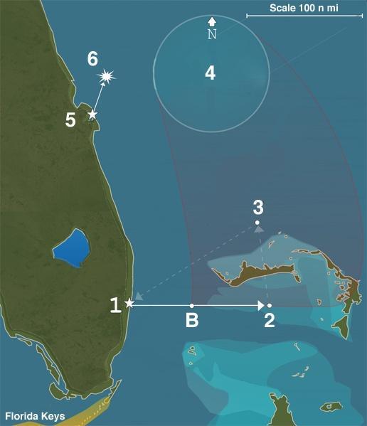 第19飞行中队事故区域。标识1-3:原定演习路线;标识4:中队偏航后无线电探测到的最后位置;标识5-6:马丁PBM-5“水手”救援机起飞与爆炸位置