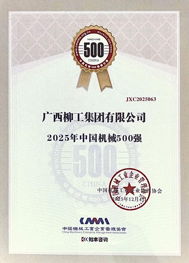 12月4日,2025年中国机械500强研究报告发布会在江苏苏州举行。柳工集团凭借卓越的综合实力与市场表现,成功斩获“2025年世界一流机械企业500强”“2025年中国机械500强”两项殊荣。
