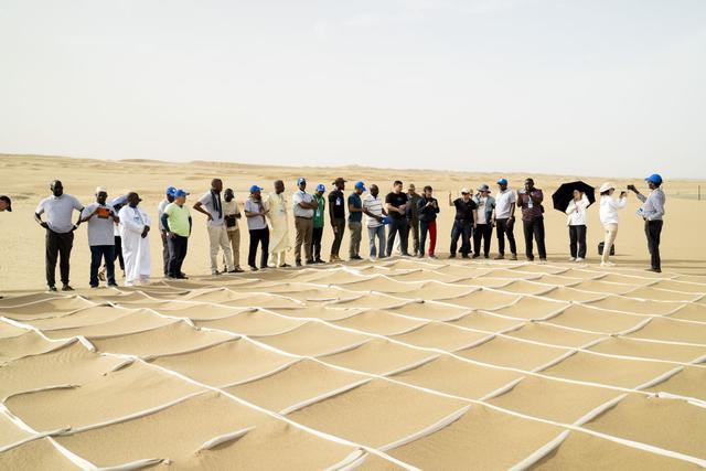 2023年6月12日,在塔克拉玛干沙漠机械防沙示范区,非洲和中亚学员参观固沙新技术。