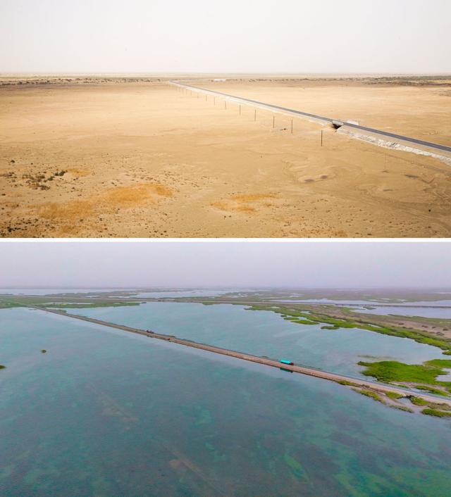 拼版照片:上图为2008年7月拍摄的干涸的台特玛湖(资料照片,塔里木河流域管理局供图);下图为2025年7月拍摄的台特玛湖(无人机照片,苏波摄)。新华社发